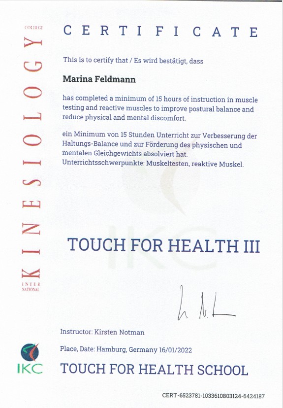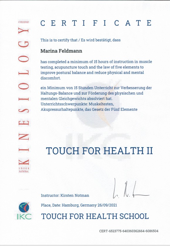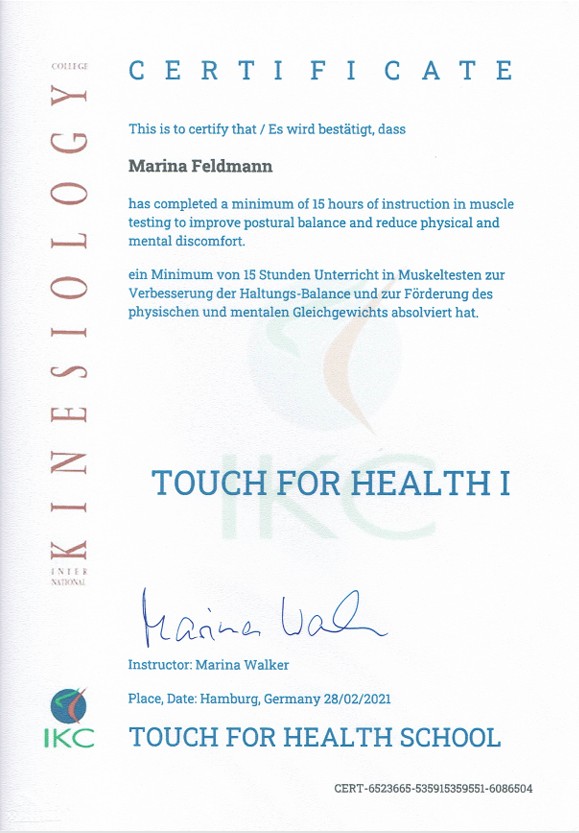 Mit einer Touch for Health-Balance können wir Ihren Energiefluss in den Meridianen mit einfachen Muskeltests aufspüren und bei einem Energieungleichgewicht balancieren. Zum Beispiel über gezielte Körperberührungen an den Neurovaskulären Punkten oder die sanfte Massage der Neurolymphatischen Zonen. Ist Ihr Meridiansystem ausgeglichen, kommen Sie in Ihre Kraft, Gelassenheit, Konzentration und mehr körperliche Leistungsfähigkeit.